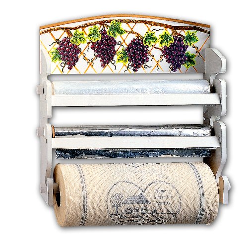 Take a look at this BRAND NEW Grape design 3-Roll Wrap Center. This beautiful piece is meant to mount on a wall and will hold three different rolls of your liking. Most people use this rack to hold a paper towel roll, a Saran Wrap roll, and an aluminum foil roll. Two of the edges for the rolls have a metal serraded cutting edge on them so that they can easily cut the plastic / Saran wrap and aluminum foil. Certainly, a very useful tool and an almost necessity for any kitchen!