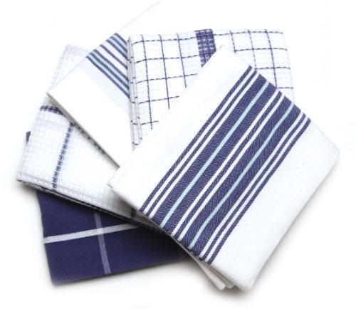 This Set of 5 Navy Blue and White Kitchen Towels from Mahogany gives you a wonderful assortment of patterns and weaves for your kitchen. Each towel is 100-percent woven cotton, with a Navy Blue pattern woven into each white 28-Inch by 18-Inch towel. Each set contains one each herringbone weave center stripe, one center double-stripe, one 1-Inch windowpane check on a waffle weave towel, one wide check on a waffle weave towel, and finally one white check on a contrasting Navy Blue woven towel. Each towel has a sewn-in loop for easy hanging on a hook or rack, and all Mahogany kitchen towels are completely machine washable.